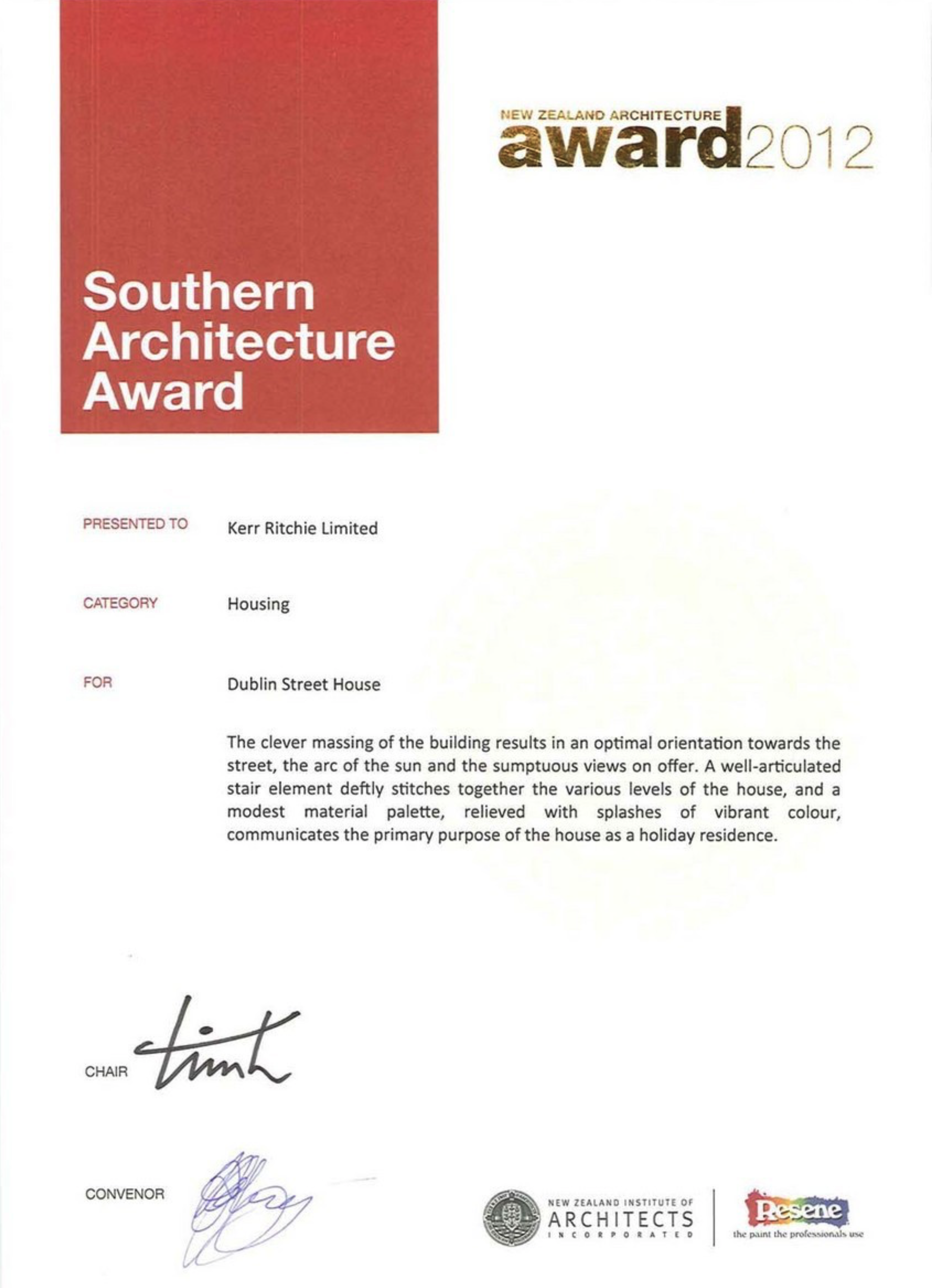 In 2012, Snowbird won the Southern Architecture Award "The clever massing of the building results in an optimal orientation towards the street, the arc of the sun and the sumptuous views on offer. A well-articulated stair element deftly stitches together the various levels of the house, and a modest material palette, relieved with splashes of vibrant colour, communicates the primary purpose of the house as a holiday residence."